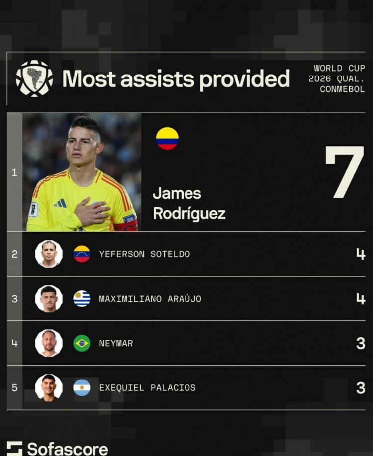 直播吧9月11日讯 本届南美世预赛结束,Sofascore统计了球员送出助攻的次数,J罗7助居首。
