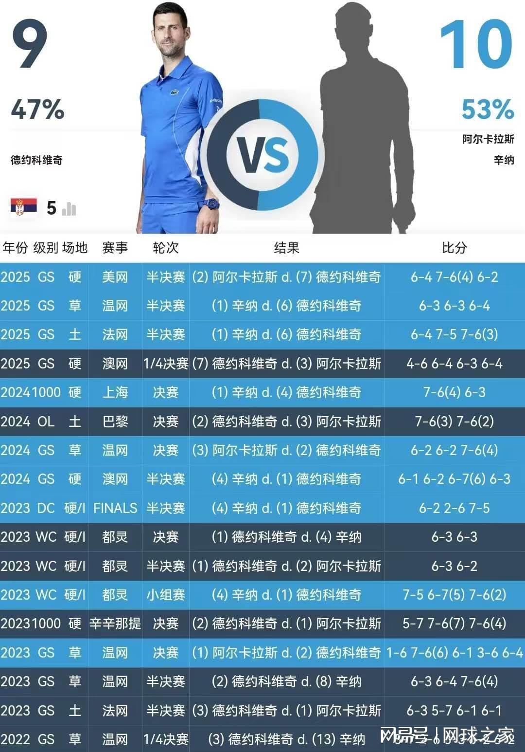 首先来看看对阵辛纳,德约首次在硬地对阵辛纳是在前年的年终总决赛小组赛上,当时本土作战的辛纳力克对手,最终把德约逼到小组险些不能出线的局面。