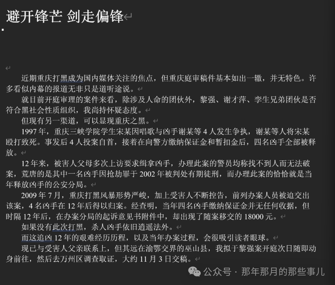 但我在重庆的十多天里,大多数时间都感到很郁闷。报社派你到重庆采访,眼看着别家媒体稿件铺天盖地,自己每天只发短短几百字的消息也颜面无光。但是做深度采访吧,却发现案件中有许多矛盾的地方,比如被指控为团伙头目的谢才萍,一审被指控犯组织、领导黑社会性质组织罪、开设赌场罪、非法拘禁罪、容留他人吸毒罪、行贿罪五宗罪。但在起诉书中,该团伙对欠赌债未结清的人,实施了非法拘禁过程中的暴力是“用矿泉水瓶子击打其头部”。这样的黑社会组织与从小看的港台片里的黑社会差异太大,于是就让我很迷惑,这样的黑恶势力的深度报道我该如何写?