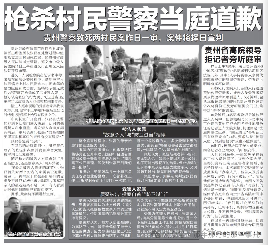 2010年9月17日,原安顺市关岭县坡贡镇派出所副所长涉嫌故意杀人案将异地由遵义市中级人民法院开审理。此时,距离案发已整整过去了248天。刘虎等一众记者前去采访,遭法庭以无座位为由婉拒,南都女记者以家属名义进入法庭后,很快被识别后礼送出门。